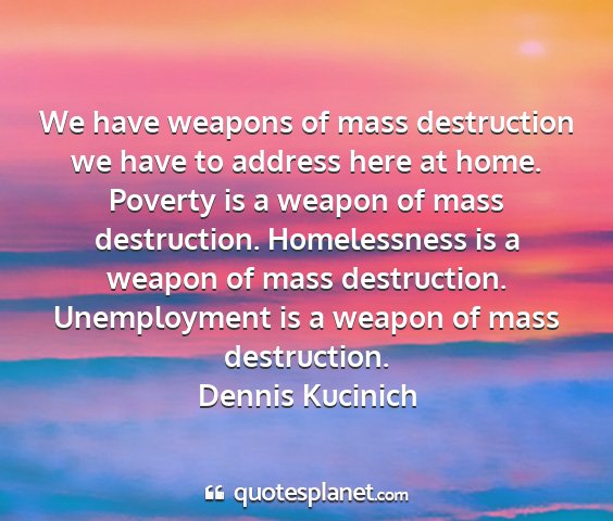 We have weapons of mass destruction we have to address here at home. Poverty is a weapon of mass destruction. Homelessness is a weapon of mass destruction. Unemployment is a weapon of mass destruction.Dennis Kucinich