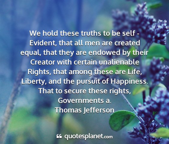 We hold these truths to be self - Evident, that all men are created equal, that they are endowed by their Creator with certain unalienable Rights, that among these are Life, Liberty, and the pursuit of Happiness. That to secure these rights, Governments a.Thomas Jefferson