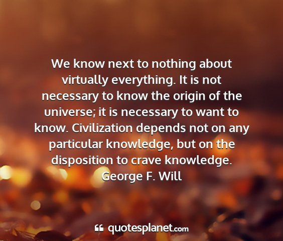 We know next to nothing about virtually everything. It is not necessary to know the origin of the universe; it is necessary to want to know. Civilization depends not on any particular knowledge, but on the disposition to crave knowledge.George F. Will