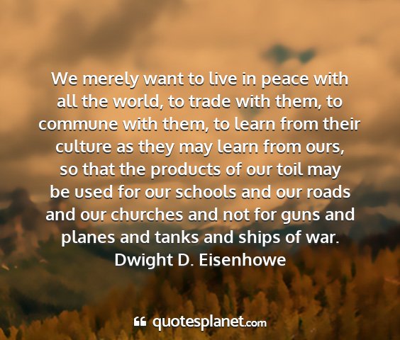 We merely want to live in peace with all the world, to trade with them, to commune with them, to learn from their culture as they may learn from ours, so that the products of our toil may be used for our schools and our roads and our churches and not for guns and planes and tanks and ships of war.Dwight D. Eisenhowe
