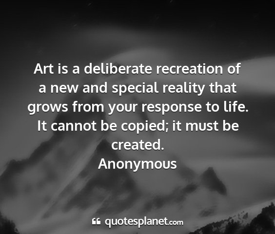 Art is a deliberate recreation of a new and special reality that grows from your response to life. It cannot be copied; it must be created.Anonymous