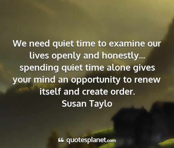 We need quiet time to examine our lives openly and honestly... spending quiet time alone gives your mind an opportunity to renew itself and create order.Susan Taylo