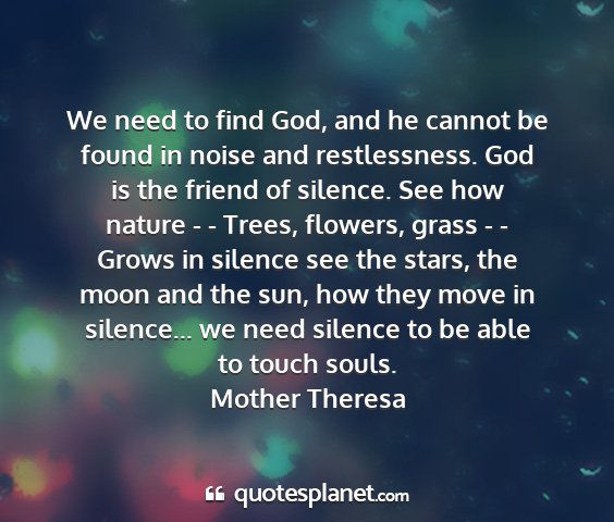 We need to find God, and he cannot be found in noise and restlessness. God is the friend of silence. See how nature - - Trees, flowers, grass - - Grows in silence see the stars, the moon and the sun, how they move in silence... we need silence to be able to touch souls.Mother Theresa