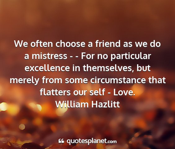 We often choose a friend as we do a mistress - - For no particular excellence in themselves, but merely from some circumstance that flatters our self - Love.William Hazlitt