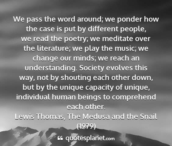 We pass the word around; we ponder how the case is put by different people, we read the poetry; we meditate over the literature; we play the music; we change our minds; we reach an understanding. Society evolves this way, not by shouting each other down, but by the unique capacity of unique, individual human beings to comprehend each other.Lewis Thomas, The Medusa and the Snail (1979)