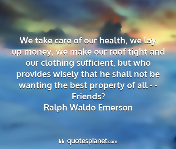 We take care of our health, we lay up money, we make our roof tight and our clothing sufficient, but who provides wisely that he shall not be wanting the best property of all - - Friends?Ralph Waldo Emerson