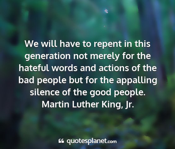We will have to repent in this generation not merely for the hateful words and actions of the bad people but for the appalling silence of the good people.Martin Luther King, Jr.