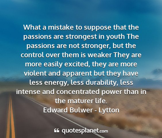 What a mistake to suppose that the passions are strongest in youth The passions are not stronger, but the control over them is weaker They are more easily excited, they are more violent and apparent but they have less energy, less durability, less intense and concentrated power than in the maturer life.Edward Bulwer - Lytton