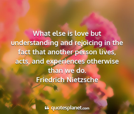 What else is love but understanding and rejoicing in the fact that another person lives, acts, and experiences otherwise than we do.Friedrich Nietzsche