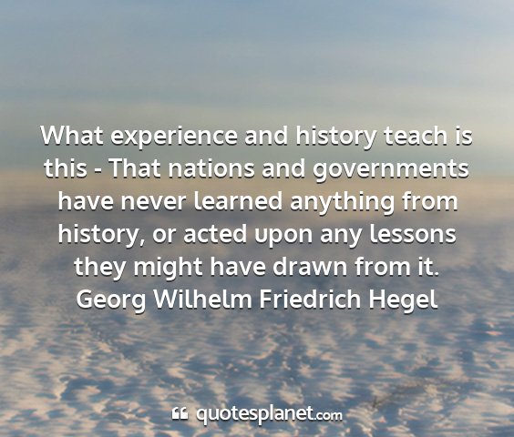 What experience and history teach is this - That nations and governments have never learned anything from history, or acted upon any lessons they might have drawn from it.Georg Wilhelm Friedrich Hegel