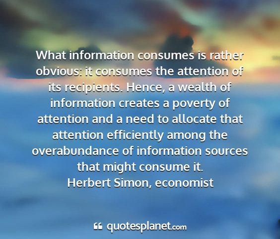 What information consumes is rather obvious: it consumes the attention of its recipients. Hence, a wealth of information creates a poverty of attention and a need to allocate that attention efficiently among the overabundance of information sources that might consume it.Herbert Simon, economist