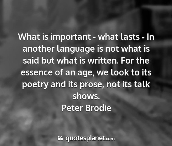 What is important - what lasts - In another language is not what is said but what is written. For the essence of an age, we look to its poetry and its prose, not its talk shows.Peter Brodie
