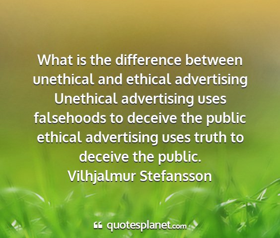 What is the difference between unethical and ethical advertising Unethical advertising uses falsehoods to deceive the public ethical advertising uses truth to deceive the public.Vilhjalmur Stefansson
