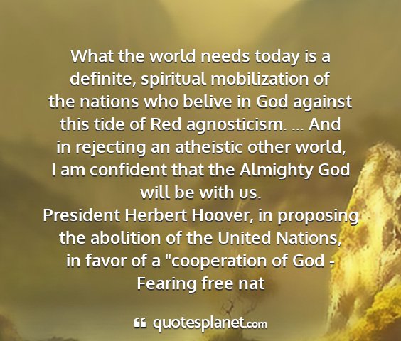What the world needs today is a definite, spiritual mobilization of the nations who belive in God against this tide of Red agnosticism. ... And in rejecting an atheistic other world, I am confident that the Almighty God will be with us.President Herbert Hoover, in proposing the abolition of the United Nations, in favor of a "cooperation of God - Fearing free nat