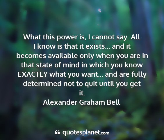 What this power is, I cannot say. All I know is that it exists... and it becomes available only when you are in that state of mind in which you know EXACTLY what you want... and are fully determined not to quit until you get it.Alexander Graham Bell