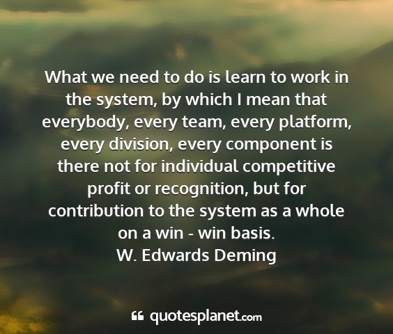 What we need to do is learn to work in the system, by which I mean that everybody, every team, every platform, every division, every component is there not for individual competitive profit or recognition, but for contribution to the system as a whole on a win - win basis.W. Edwards Deming