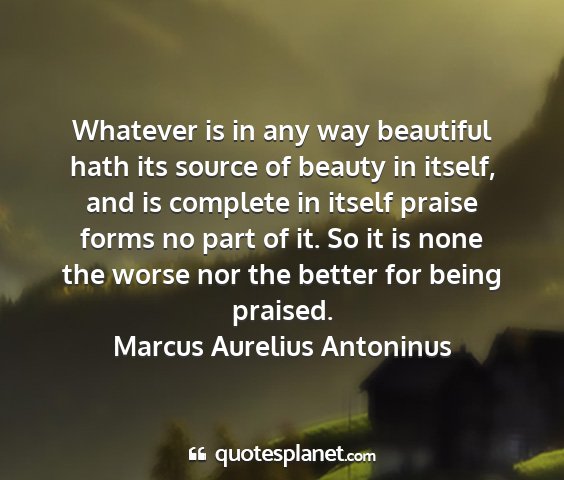 Whatever is in any way beautiful hath its source of beauty in itself, and is complete in itself praise forms no part of it. So it is none the worse nor the better for being praised.Marcus Aurelius Antoninus