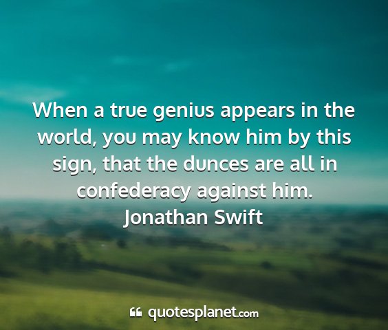 When a true genius appears in the world, you may know him by this sign, that the dunces are all in confederacy against him.Jonathan Swift