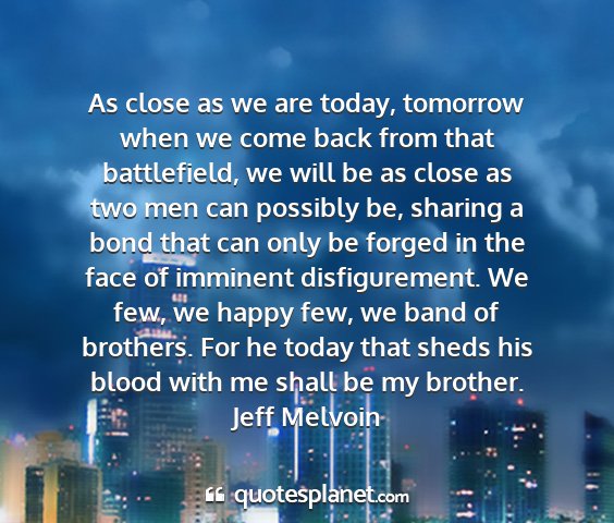 As close as we are today, tomorrow when we come back from that battlefield, we will be as close as two men can possibly be, sharing a bond that can only be forged in the face of imminent disfigurement. We few, we happy few, we band of brothers. For he today that sheds his blood with me shall be my brother.Jeff Melvoin