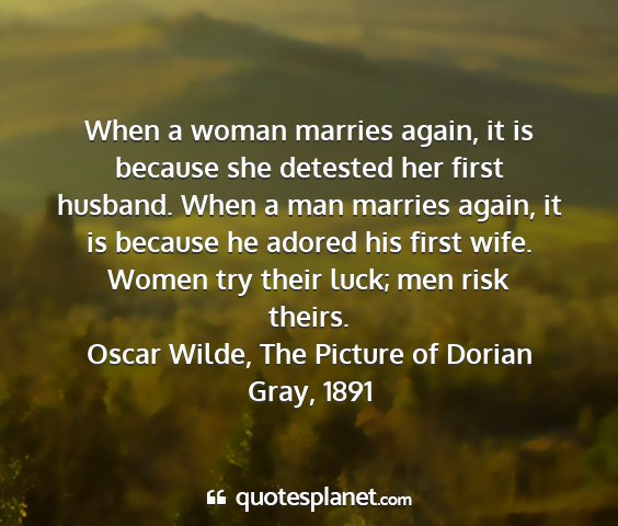When a woman marries again, it is because she detested her first husband. When a man marries again, it is because he adored his first wife. Women try their luck; men risk theirs.Oscar Wilde, The Picture of Dorian Gray, 1891