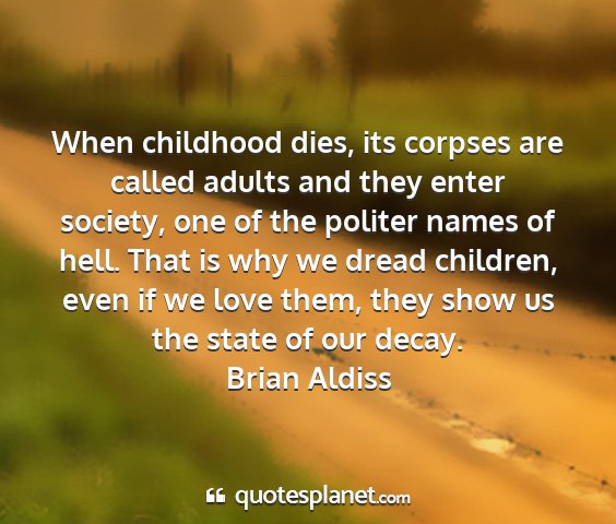 When childhood dies, its corpses are called adults and they enter society, one of the politer names of hell. That is why we dread children, even if we love them, they show us the state of our decay.Brian Aldiss