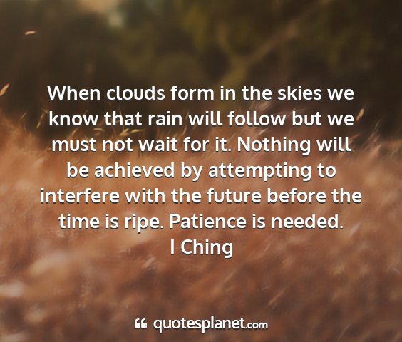 When clouds form in the skies we know that rain will follow but we must not wait for it. Nothing will be achieved by attempting to interfere with the future before the time is ripe. Patience is needed.I Ching