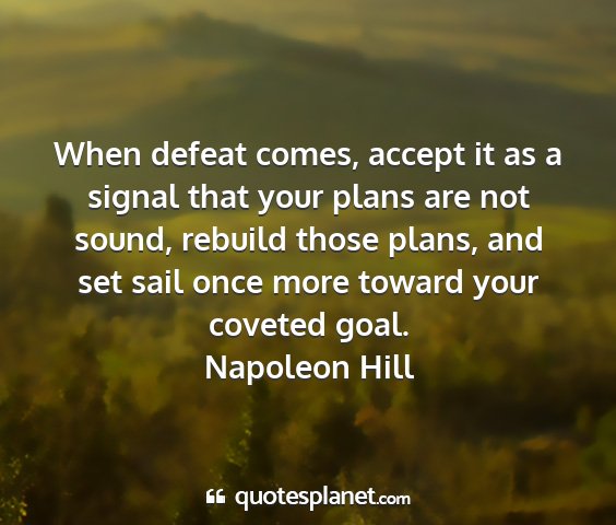 When defeat comes, accept it as a signal that your plans are not sound, rebuild those plans, and set sail once more toward your coveted goal.Napoleon Hill