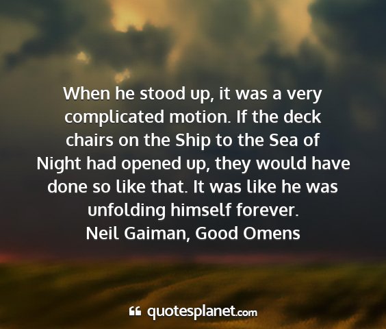 When he stood up, it was a very complicated motion. If the deck chairs on the Ship to the Sea of Night had opened up, they would have done so like that. It was like he was unfolding himself forever.Neil Gaiman, Good Omens
