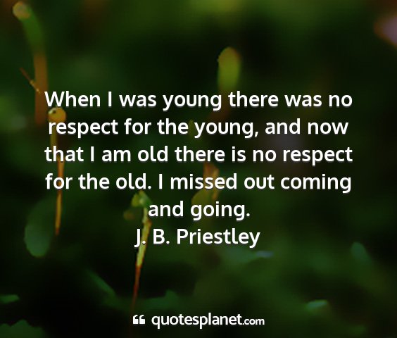 When I was young there was no respect for the young, and now that I am old there is no respect for the old. I missed out coming and going.J. B. Priestley