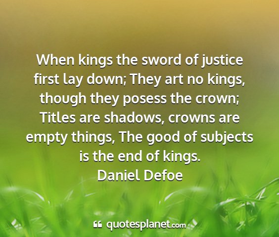 When kings the sword of justice first lay down; They art no kings, though they posess the crown; Titles are shadows, crowns are empty things, The good of subjects is the end of kings.Daniel Defoe
