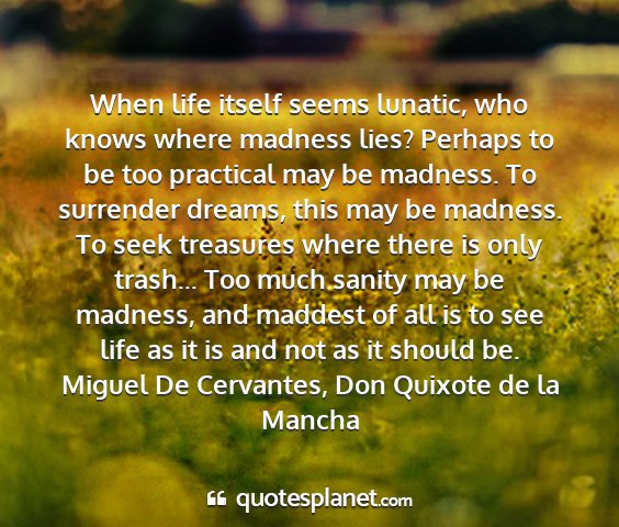 When life itself seems lunatic, who knows where madness lies? Perhaps to be too practical may be madness. To surrender dreams, this may be madness. To seek treasures where there is only trash... Too much sanity may be madness, and maddest of all is to see life as it is and not as it should be.Miguel De Cervantes, Don Quixote de la Mancha