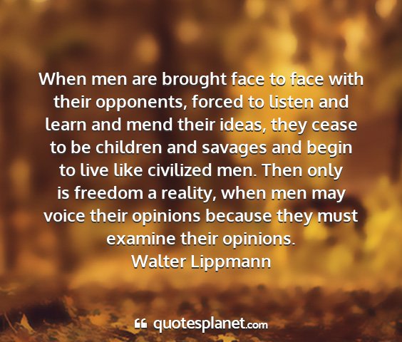 When men are brought face to face with their opponents, forced to listen and learn and mend their ideas, they cease to be children and savages and begin to live like civilized men. Then only is freedom a reality, when men may voice their opinions because they must examine their opinions.Walter Lippmann