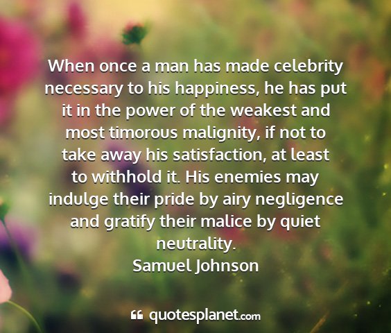 When once a man has made celebrity necessary to his happiness, he has put it in the power of the weakest and most timorous malignity, if not to take away his satisfaction, at least to withhold it. His enemies may indulge their pride by airy negligence and gratify their malice by quiet neutrality.Samuel Johnson