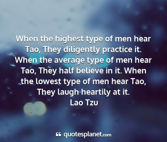 When the highest type of men hear Tao, They diligently practice it. When the average type of men hear Tao, They half believe in it. When the lowest type of men hear Tao, They laugh heartily at it.Lao Tzu