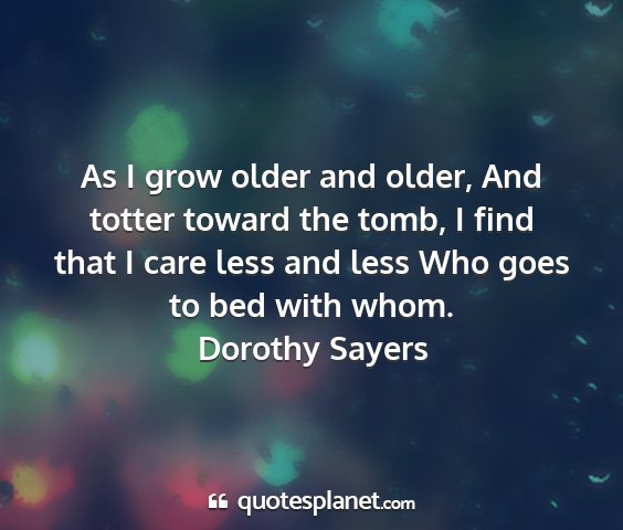 As I grow older and older, And totter toward the tomb, I find that I care less and less Who goes to bed with whom.Dorothy Sayers