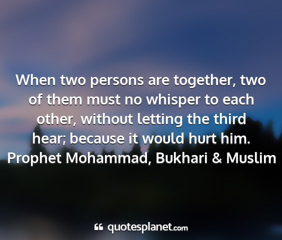 When two persons are together, two of them must no whisper to each other, without letting the third hear; because it would hurt him.Prophet Mohammad, Bukhari & Muslim