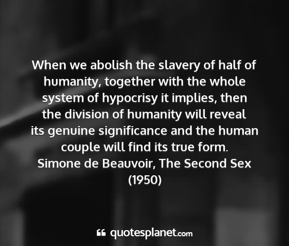 When we abolish the slavery of half of humanity, together with the whole system of hypocrisy it implies, then the division of humanity will reveal its genuine significance and the human couple will find its true form.Simone de Beauvoir, The Second Sex (1950)