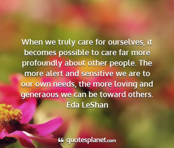 When we truly care for ourselves, it becomes possible to care far more profoundly about other people. The more alert and sensitive we are to our own needs, the more loving and generaous we can be toward others.Eda LeShan