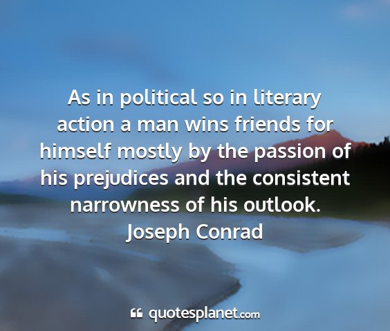 As in political so in literary action a man wins friends for himself mostly by the passion of his prejudices and the consistent narrowness of his outlook.Joseph Conrad