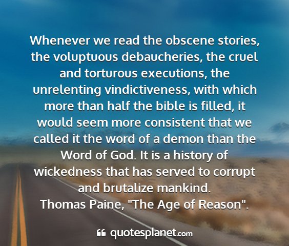 Whenever we read the obscene stories, the voluptuous debaucheries, the cruel and torturous executions, the unrelenting vindictiveness, with which more than half the bible is filled, it would seem more consistent that we called it the word of a demon than the Word of God. It is a history of wickedness that has served to corrupt and brutalize mankind.Thomas Paine, "The Age of Reason".