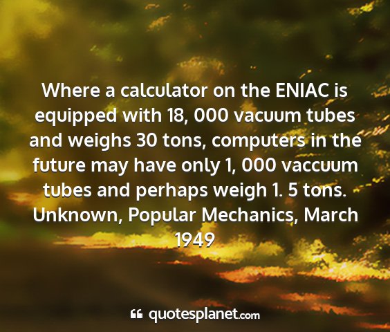Where a calculator on the ENIAC is equipped with 18, 000 vacuum tubes and weighs 30 tons, computers in the future may have only 1, 000 vaccuum tubes and perhaps weigh 1. 5 tons.Unknown, Popular Mechanics, March 1949