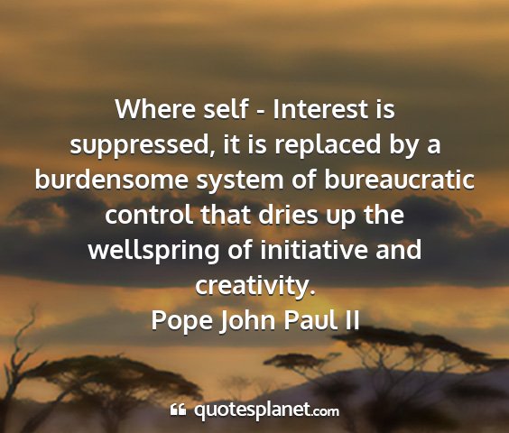 Where self - Interest is suppressed, it is replaced by a burdensome system of bureaucratic control that dries up the wellspring of initiative and creativity.Pope John Paul II