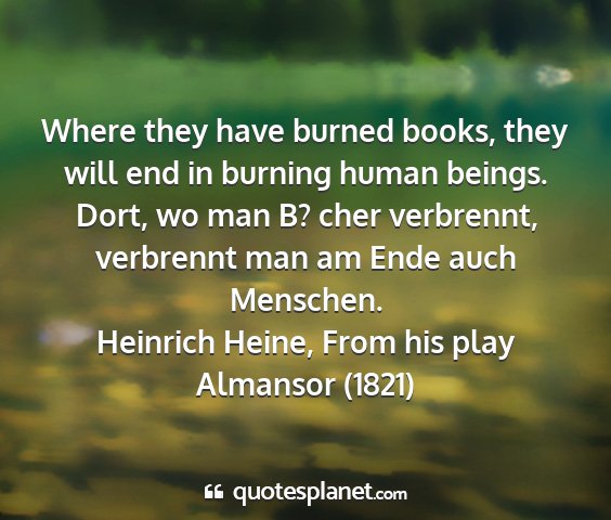 Where they have burned books, they will end in burning human beings. Dort, wo man B? cher verbrennt, verbrennt man am Ende auch Menschen.Heinrich Heine, From his play Almansor (1821)
