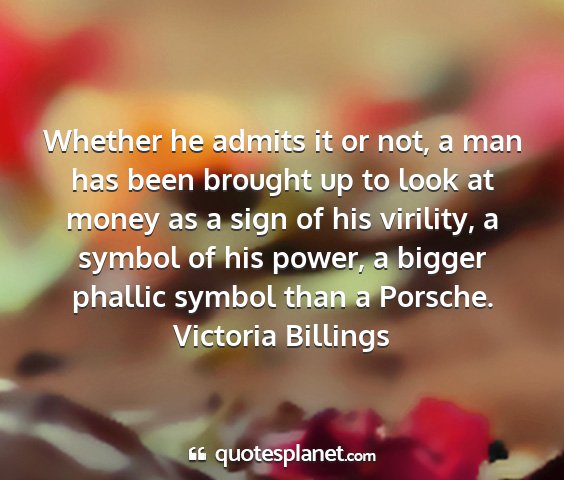 Whether he admits it or not, a man has been brought up to look at money as a sign of his virility, a symbol of his power, a bigger phallic symbol than a Porsche.Victoria Billings