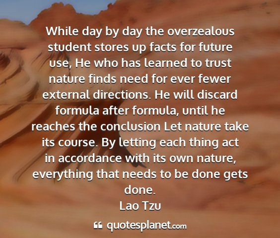 While day by day the overzealous student stores up facts for future use, He who has learned to trust nature finds need for ever fewer external directions. He will discard formula after formula, until he reaches the conclusion Let nature take its course. By letting each thing act in accordance with its own nature, everything that needs to be done gets done.Lao Tzu