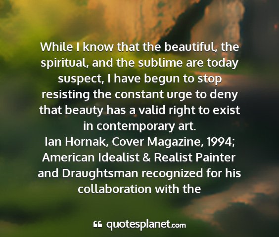 While I know that the beautiful, the spiritual, and the sublime are today suspect, I have begun to stop resisting the constant urge to deny that beauty has a valid right to exist in contemporary art.Ian Hornak, Cover Magazine, 1994; American Idealist & Realist Painter and Draughtsman recognized for his collaboration with the
