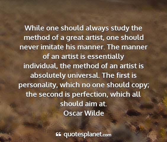 While one should always study the method of a great artist, one should never imitate his manner. The manner of an artist is essentially individual, the method of an artist is absolutely universal. The first is personality, which no one should copy; the second is perfection, which all should aim at.Oscar Wilde