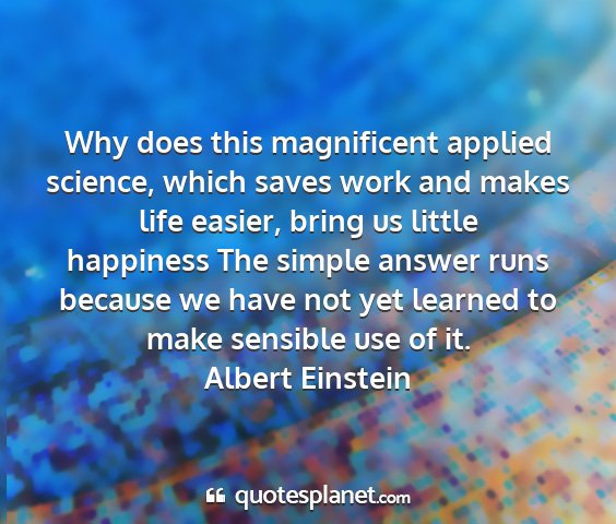 Why does this magnificent applied science, which saves work and makes life easier, bring us little happiness The simple answer runs because we have not yet learned to make sensible use of it.Albert Einstein