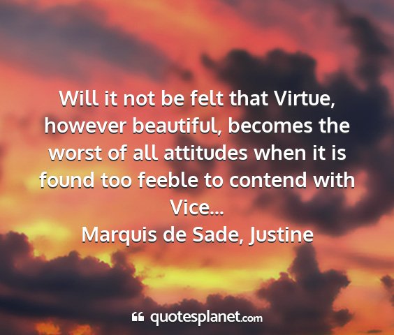 Will it not be felt that Virtue, however beautiful, becomes the worst of all attitudes when it is found too feeble to contend with Vice...Marquis de Sade, Justine