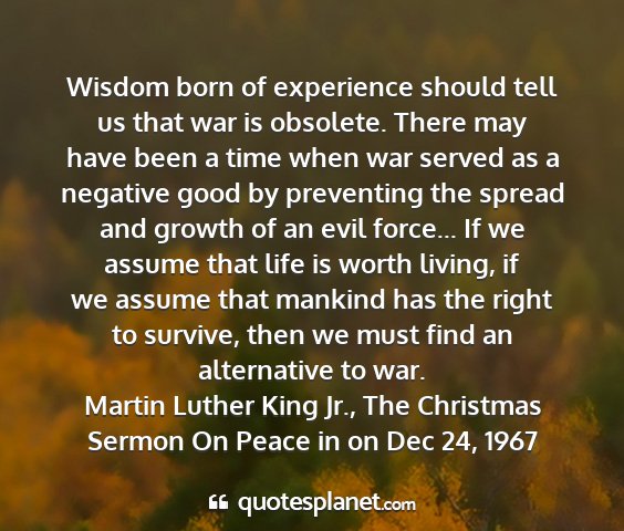 Wisdom born of experience should tell us that war is obsolete. There may have been a time when war served as a negative good by preventing the spread and growth of an evil force... If we assume that life is worth living, if we assume that mankind has the right to survive, then we must find an alternative to war.Martin Luther King Jr., The Christmas Sermon On Peace in on Dec 24, 1967